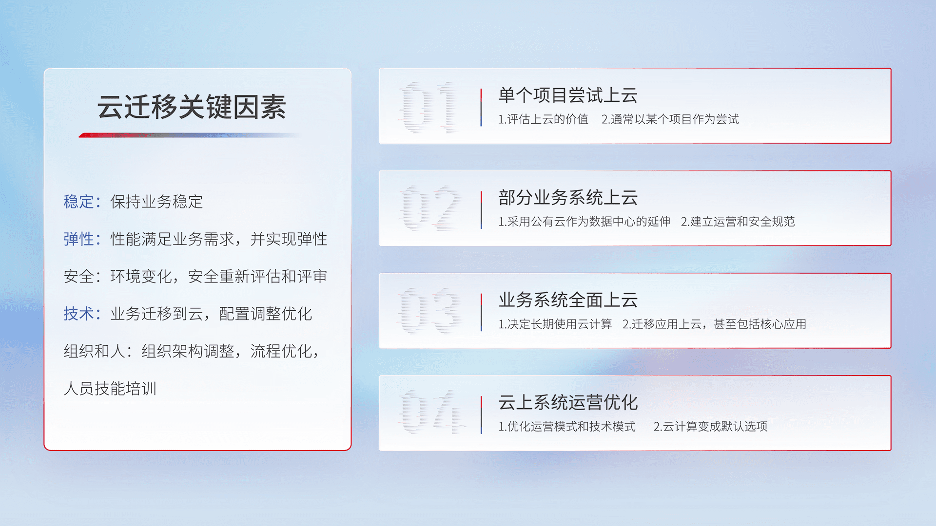 结合实际业务,,,,从规划设计、、、、云平台选型、、云原生改造、、、数据迁移、、、、集成交付,,迁移全过程为客户识别最佳上云路径,,做好风险识别管理,,,设计网络架构、、、、身份权限、、、安全审计合规、、、、操作审计、、、日志审计、、、监控告警策略、、多站点容灾设计等,,,对云上基础设施进行整体规划,,提升IT治理水平,,以满足弹性、、、高可用、、高性能的需求。。。。
