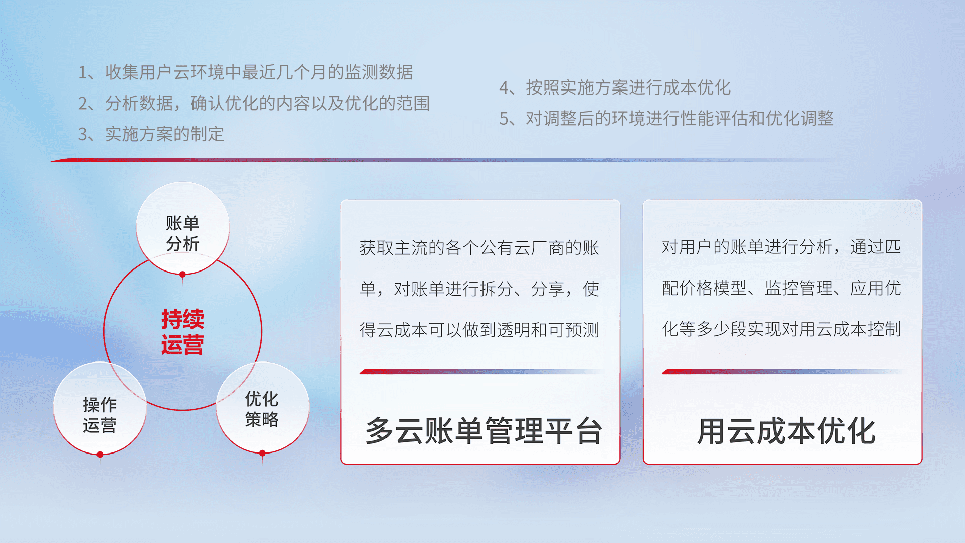 通过灵活运用多种自动化迁移工具,,帮助企业用户实现业务和数据高效 、、、稳定的上云迁移和云上迁移,,采用自研多云纳管平台,,,,以中立管理模式,,,,解决多组织、、、、多云、、、多运维厂商的复杂关系的管理,,保证多云平台资源配置的一致性,,,实时掌控云资源运行数据,,,,运用智能化工具分析云资源多云平台的管理服务,,透明化管理成本支出,,,,用云成本可预测、、用云费用可优化、、、、云资源配额有据可依。。
