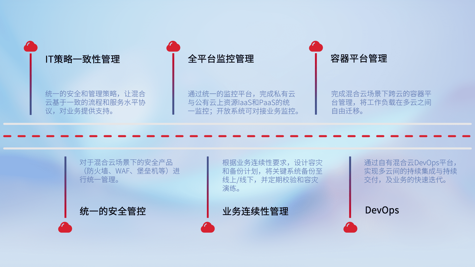 通过多云纳管,,,,以统一的资源数据模型把客户的云资源进行抽象和封装,,,进而实现对多云资源的统一操作,,,保障云资源管理的可靠性、、稳定性与可用性。。量身定制化运维内容,,,配置、、开发运维、、、补丁管理、、、、备份、、监控、、、认证和访问管理、、、审计和日常巡检等,,,,保障在用云过程中的可靠度,,,,稳定度以及高可用率。。