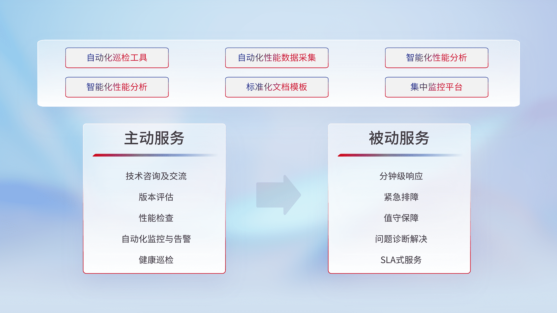 智能化工具和标准化文档,,保障服务质量,,,提供主动服务(包含技术咨询、、版本评估、、、性能检查、、、自动化监控与告警、、、、健康巡检)和被动服务包含(分钟级响应、、、紧急排障、、、值守保障、、、、问题诊断解决、、、SLA服务)。。。。