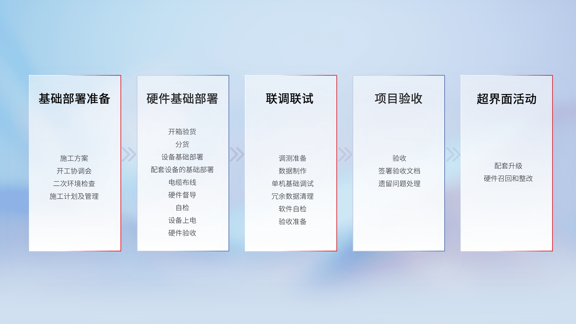 从基础部署准备、、、、硬件基础部署、、、、联调联试、、、项目验收、、、、越界面活动的全过程可追溯,,保证施工质量和进度。。